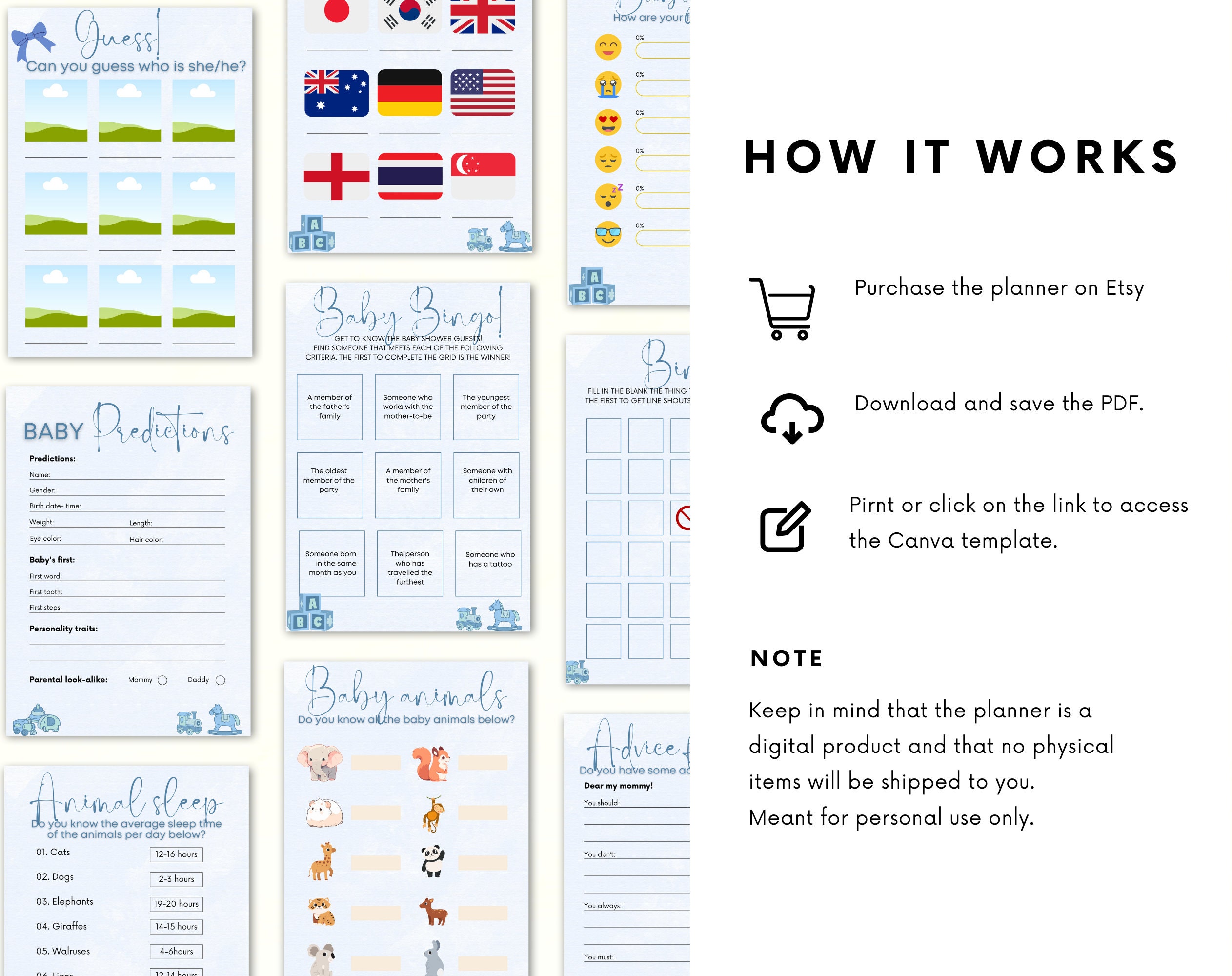 ♦ The Baby Shower Planner is meant for PERSONAL USE only. The planner DOES NOT come with a commercial license to copy, alter, share, re-sell or distribute it in any way.
