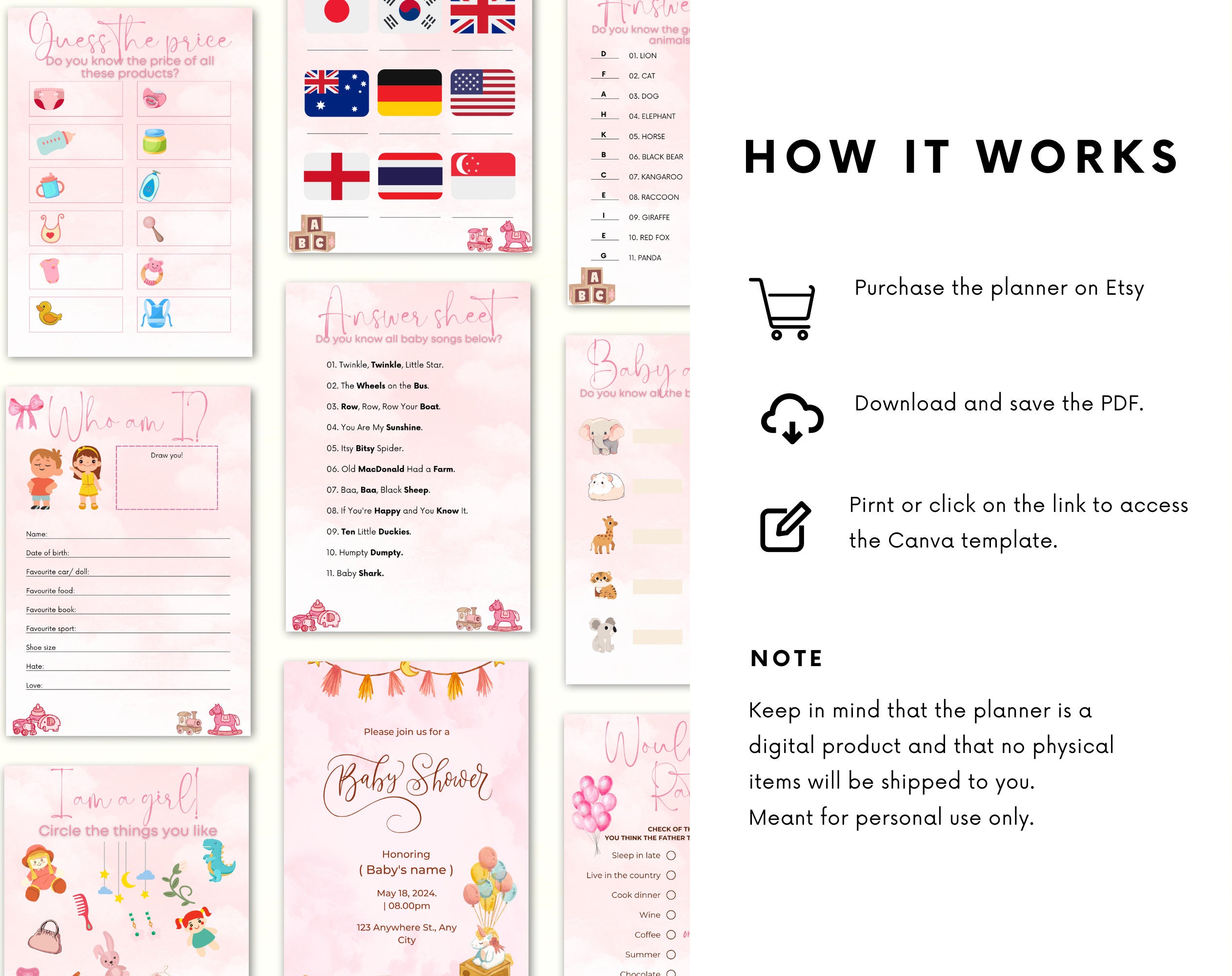 ♦ Keep in mind that this Baby Shower card games + Planner template is a digital product and that you will receive a printable PDF file. No physical items will be shipped to you.