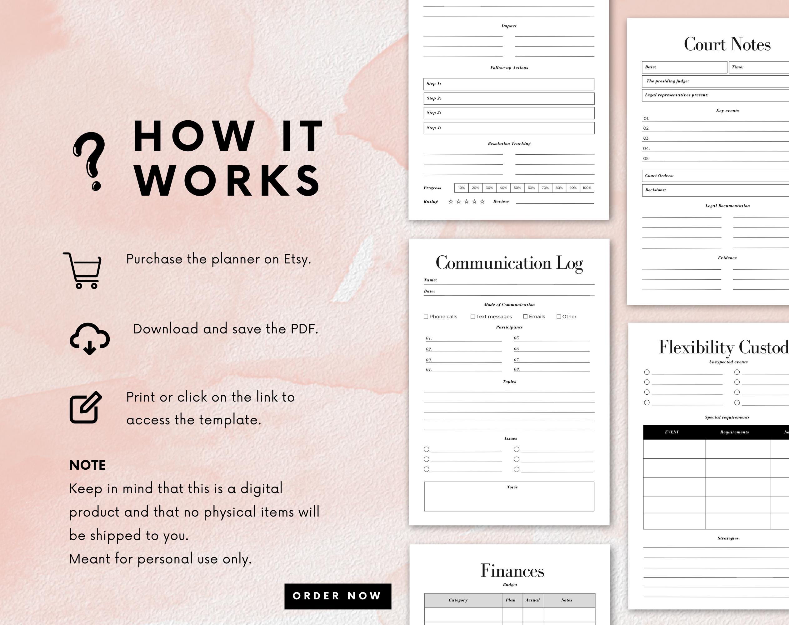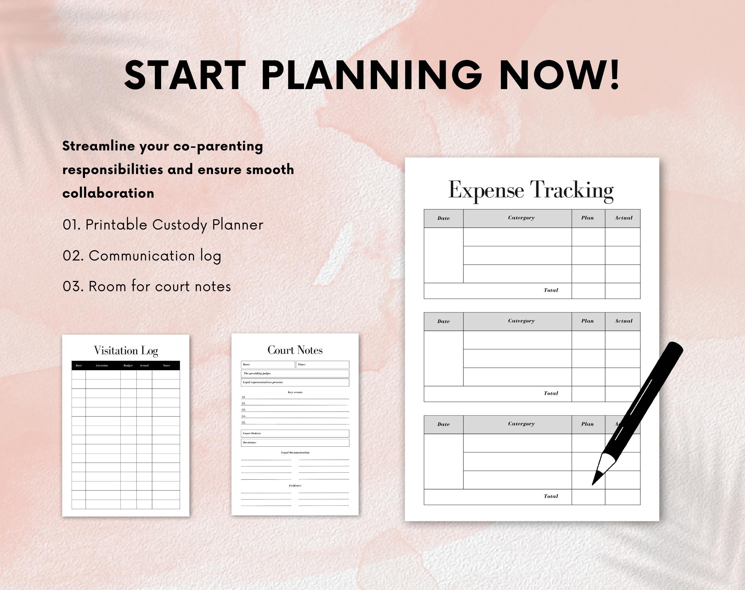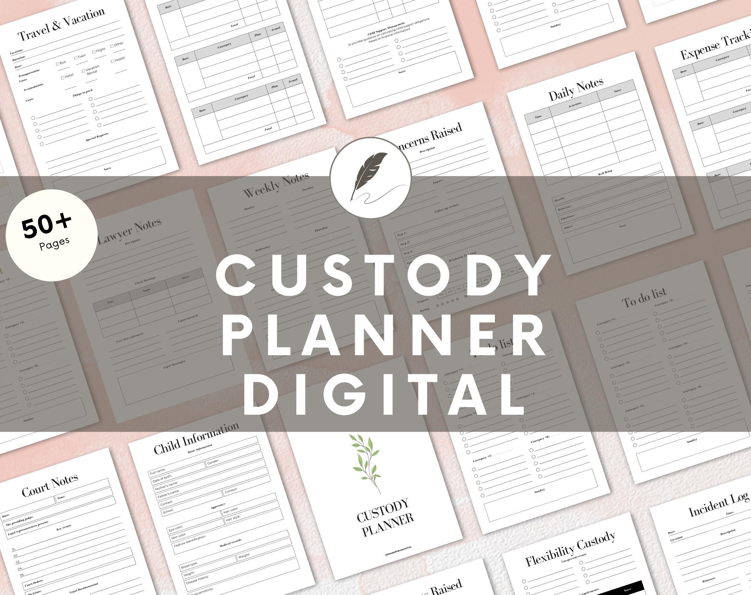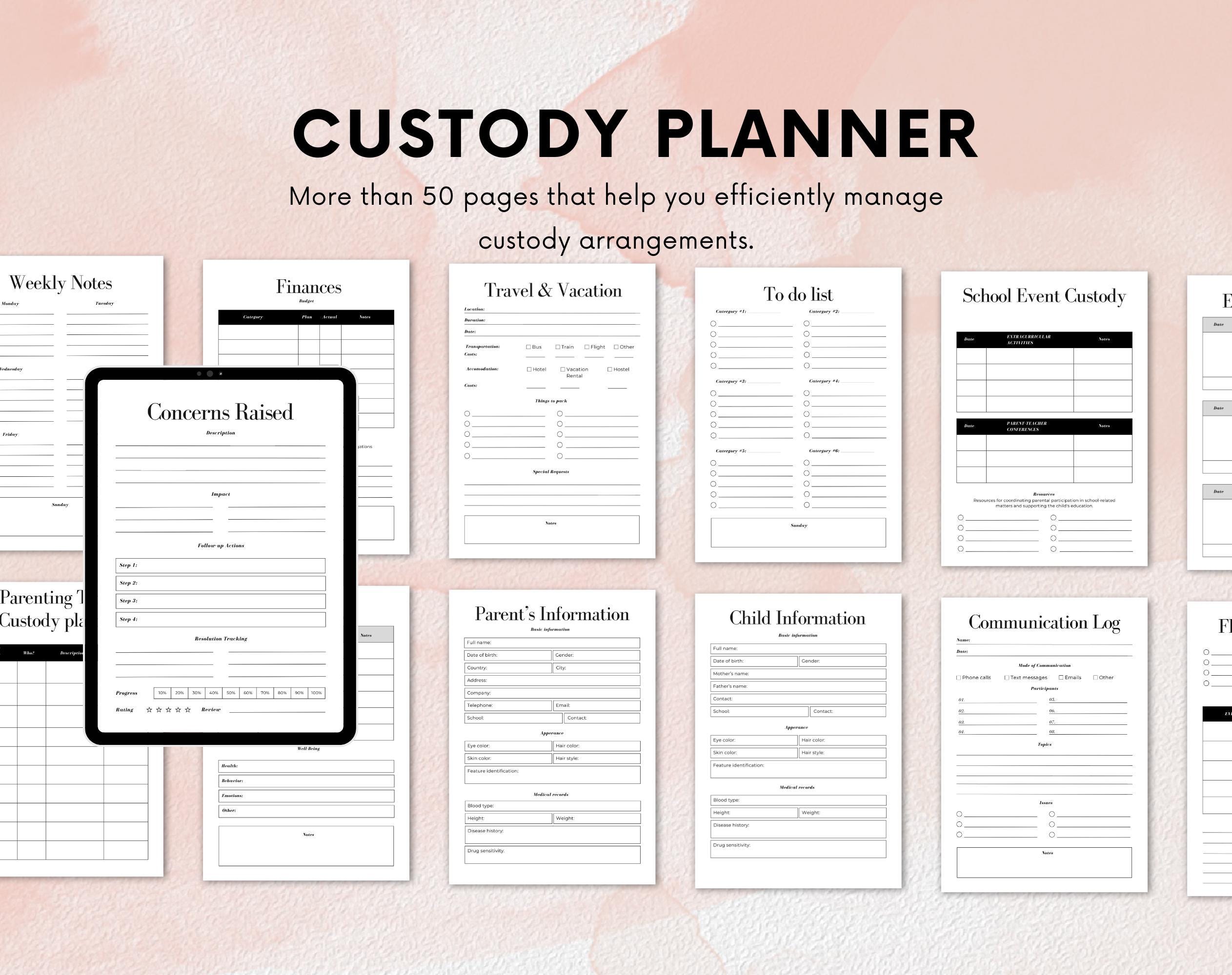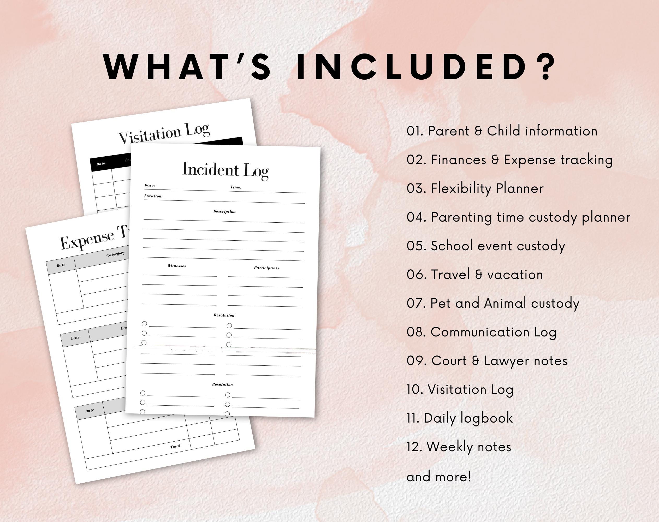With sections dedicated to tracking visitation schedules, communication logs, and