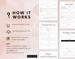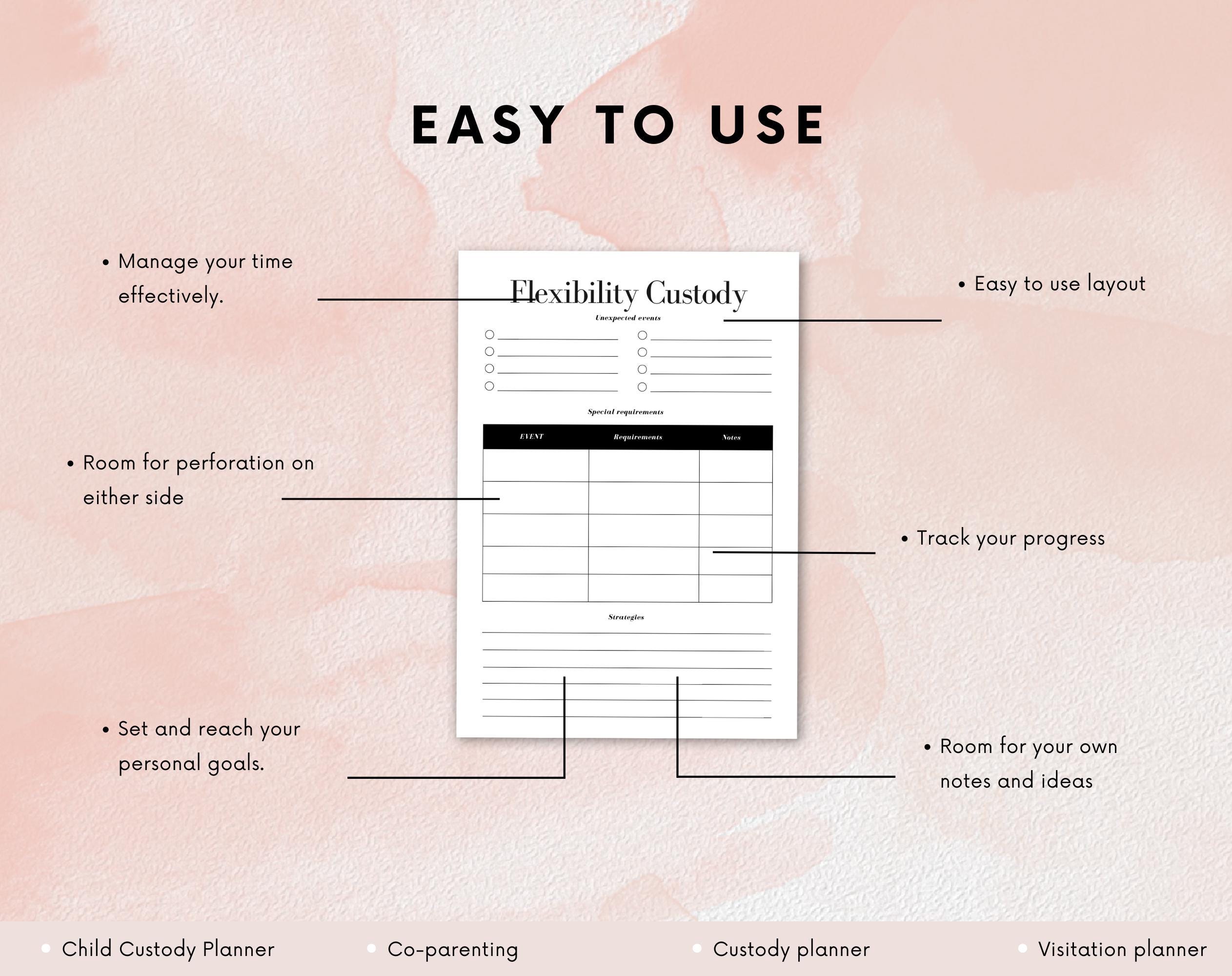 Introducing our Child Custody Planner, the ultimate tool to help parents navigate the complexities of co-parenting with ease and clarity. Designed to help you efficiently manage custody arrangements, this planner features sections for tracking important dates, visitation schedules, and communication with co-parents. This planner is an essential tool for any parent looking to manage child custody arrangements and ensure smooth communication and organization.